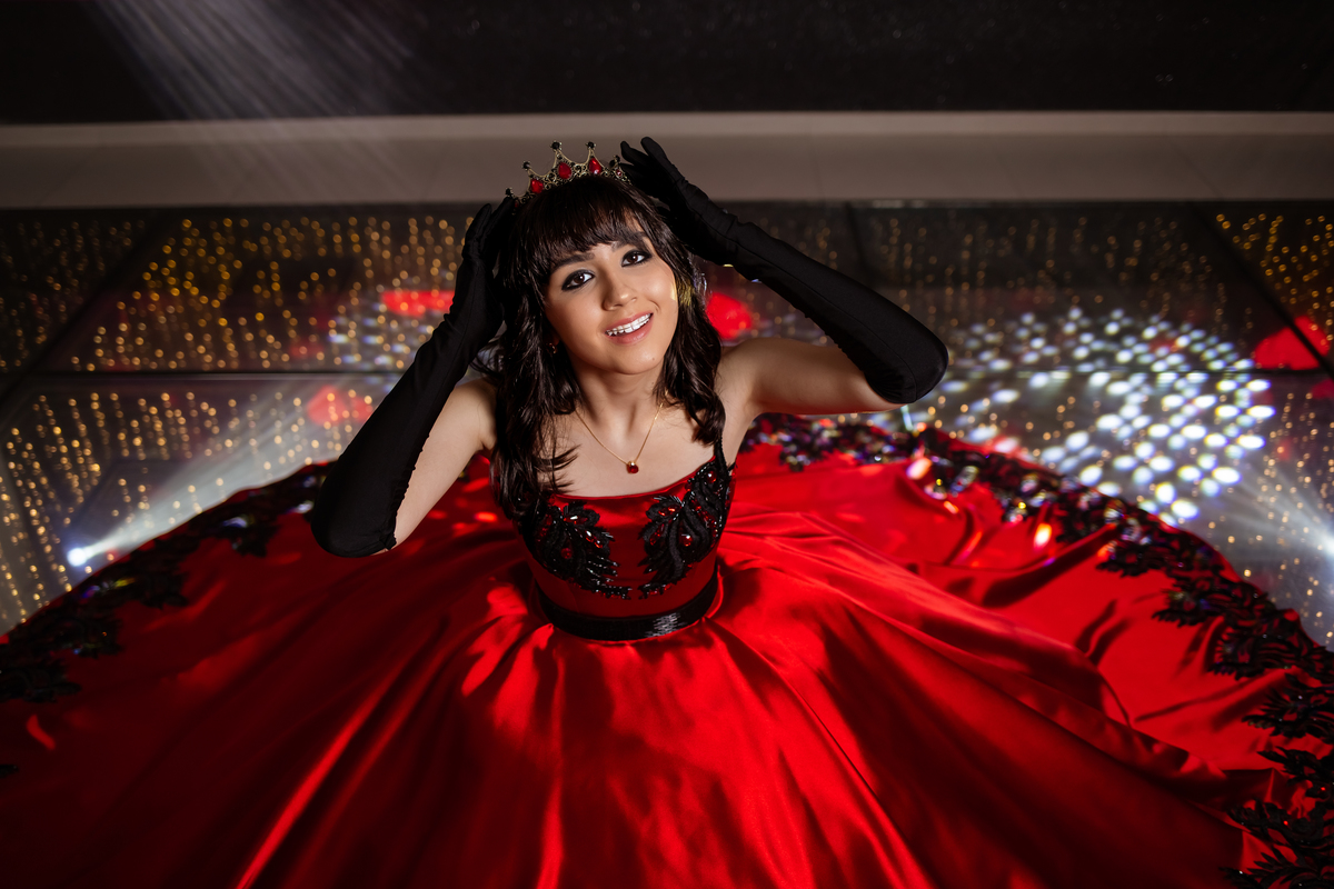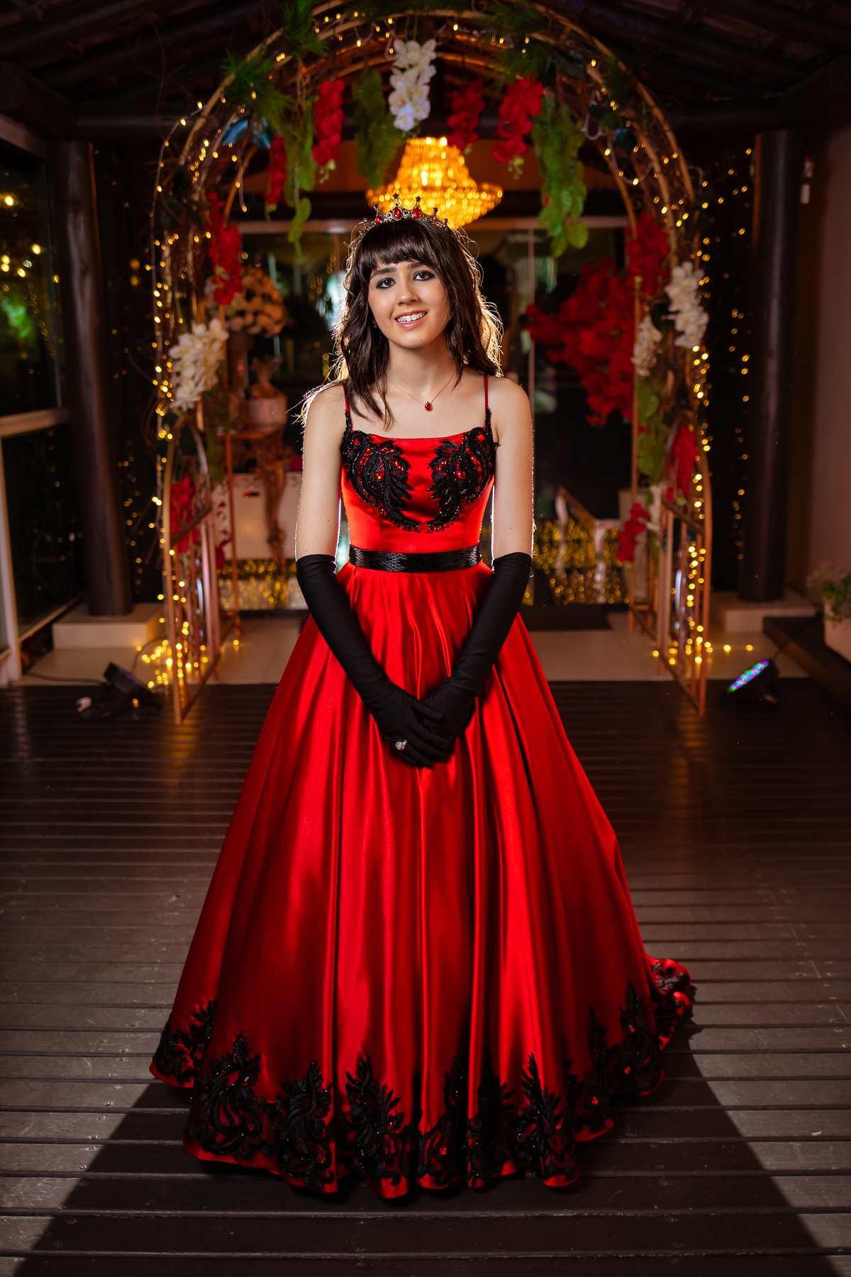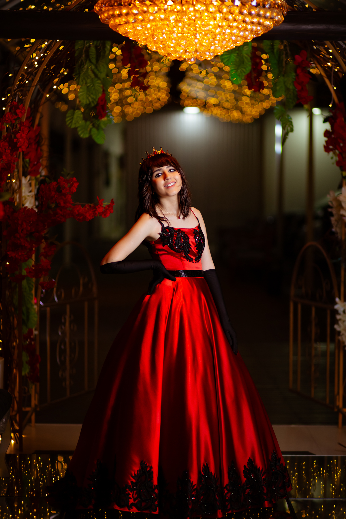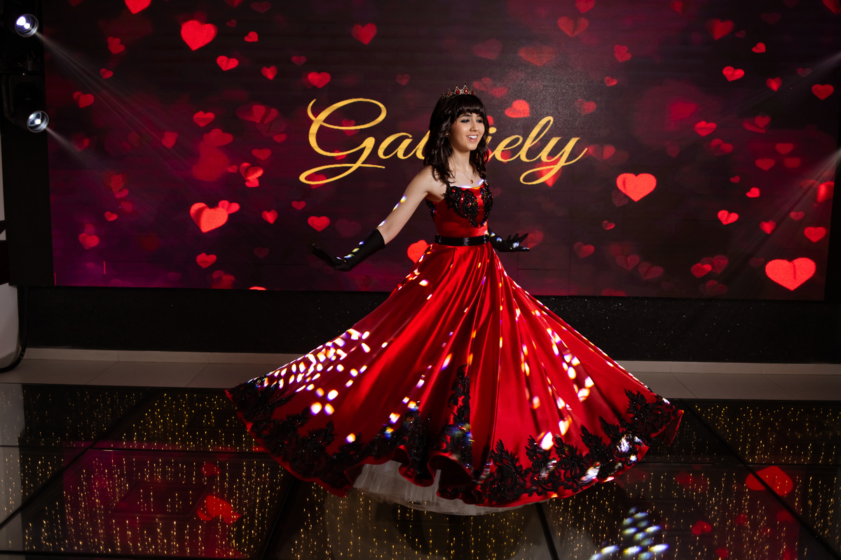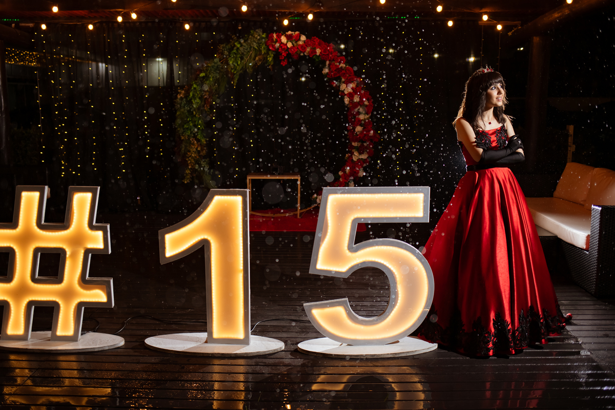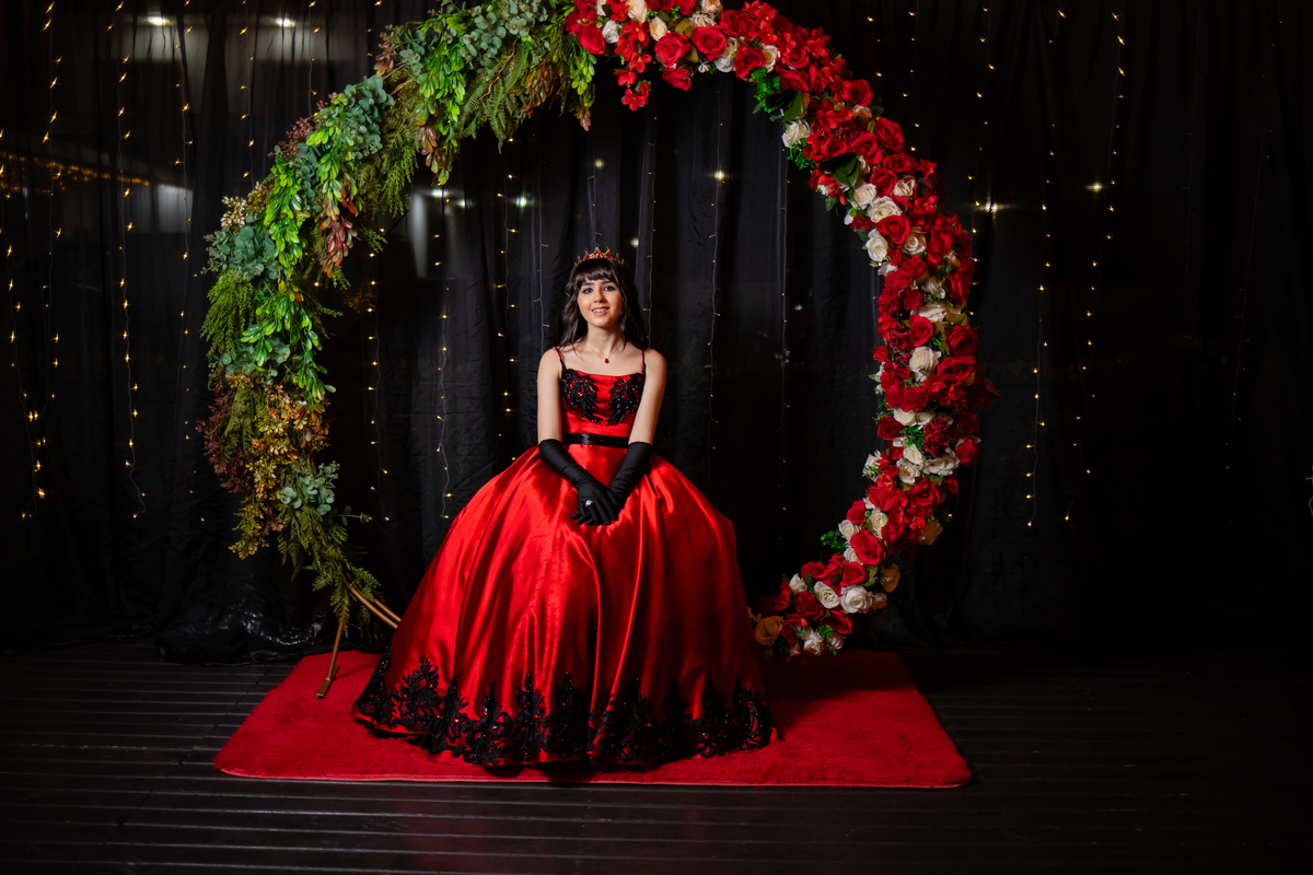 Ela chegou deslumbrante, com um vestido vermelho de princesa e um sorriso que iluminava todo o salão. A decoração estava impecável, cada detalhe pensado com carinho, e o ambiente exalava elegância e alegria.