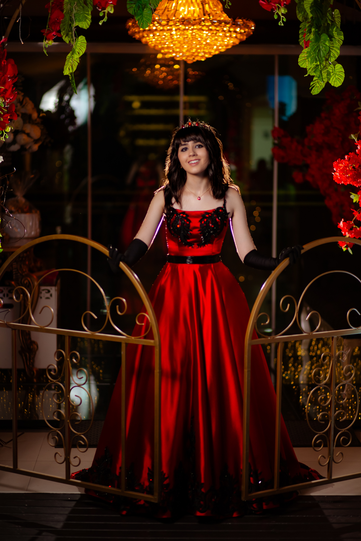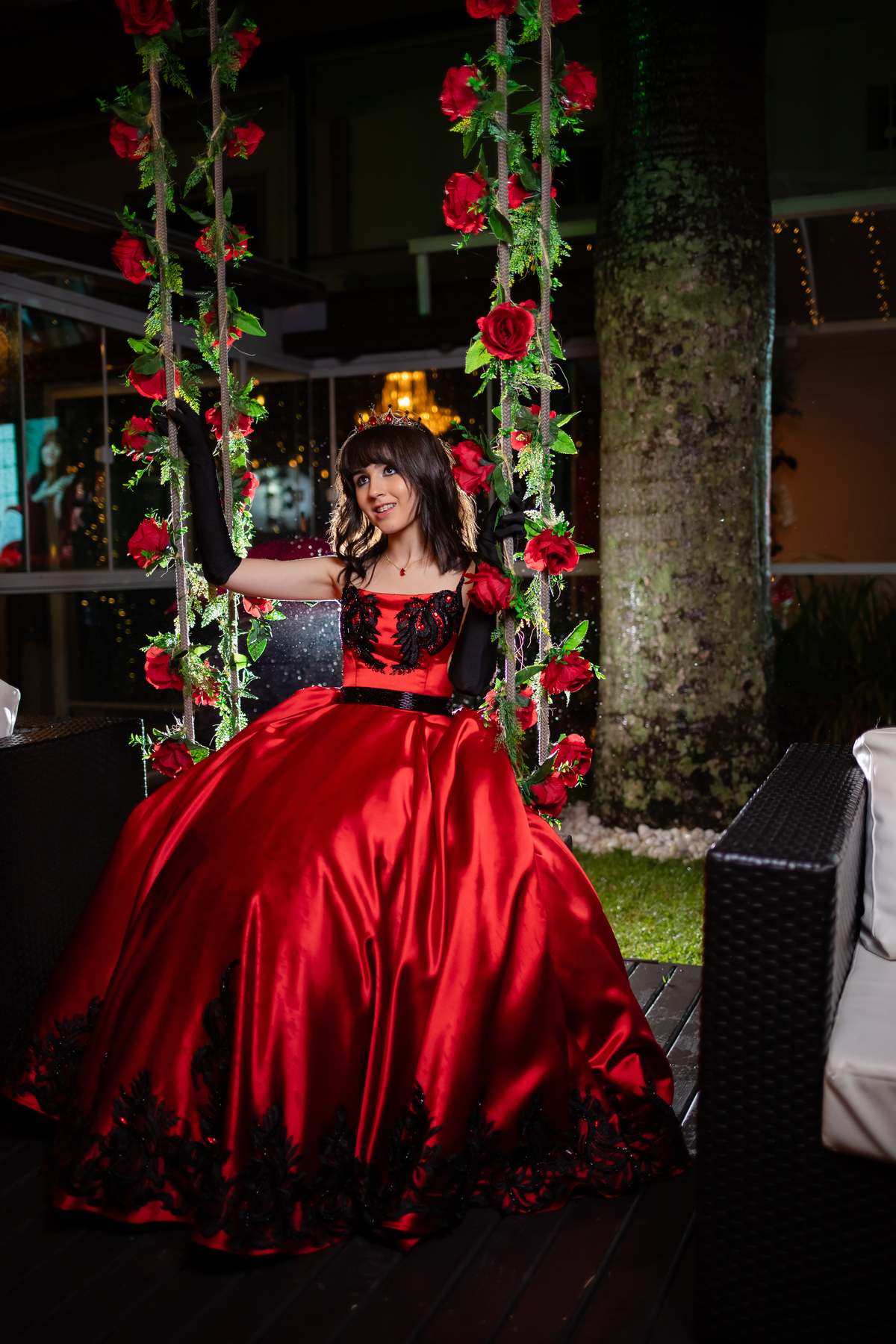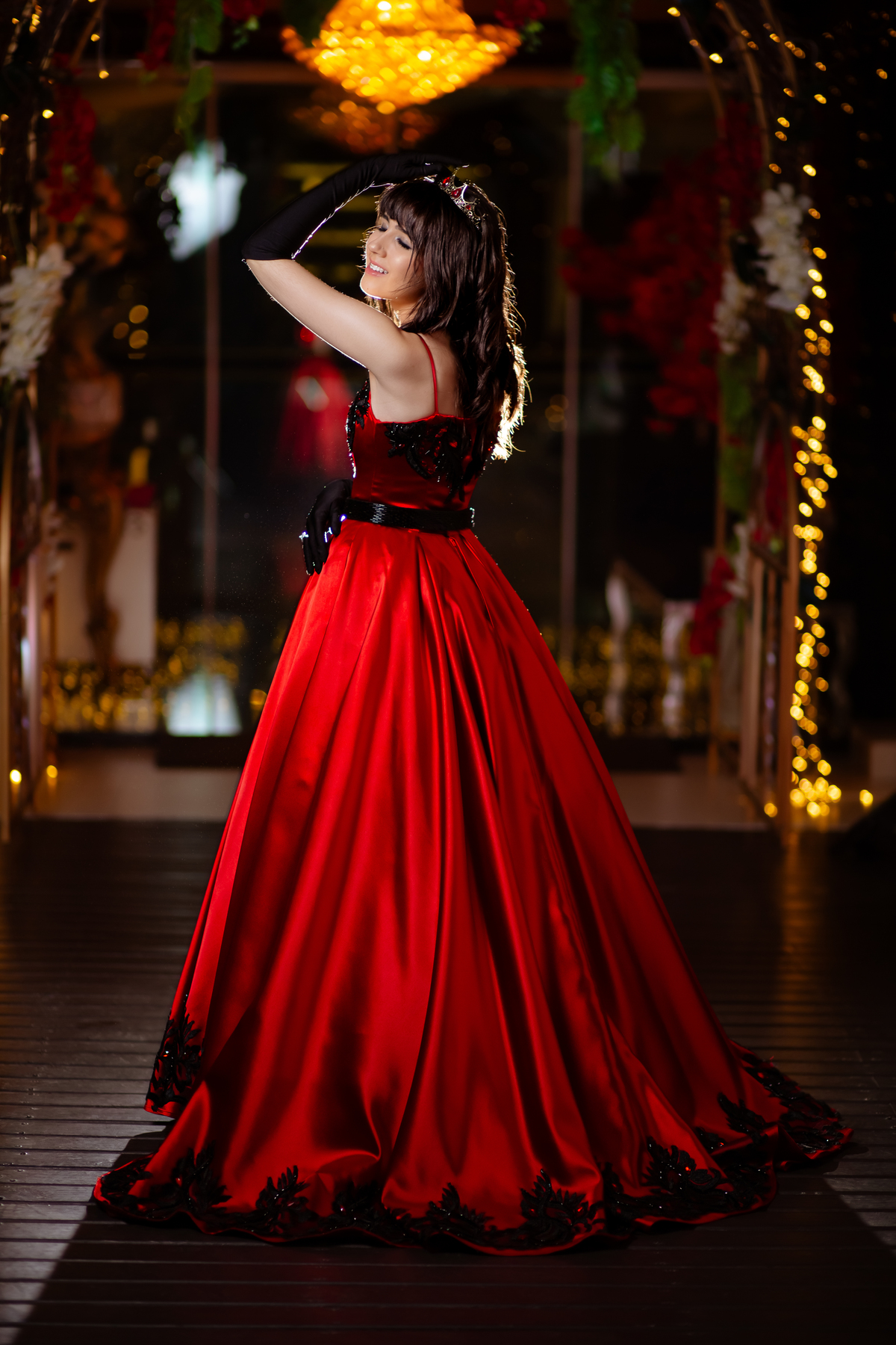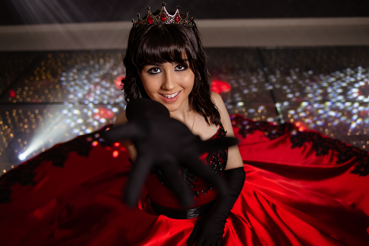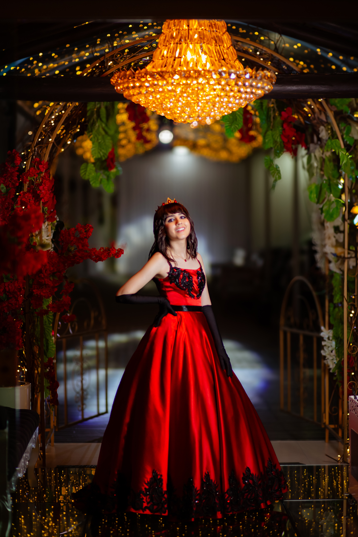 Ela chegou deslumbrante, com um vestido vermelho de princesa e um sorriso que iluminava todo o salão. A decoração estava impecável, cada detalhe pensado com carinho, e o ambiente exalava elegância e alegria.