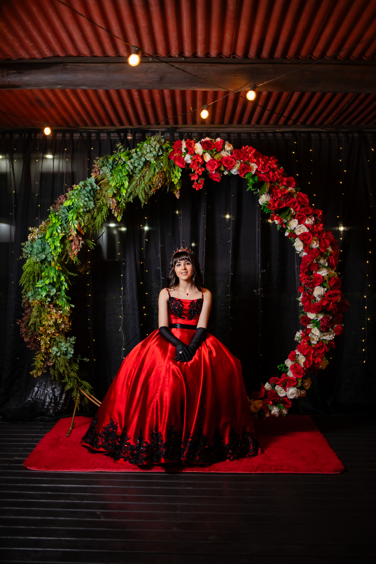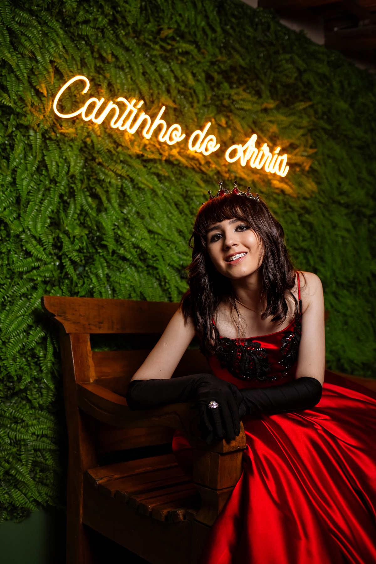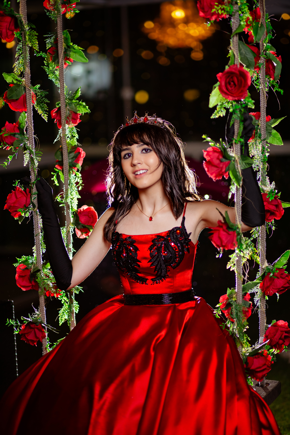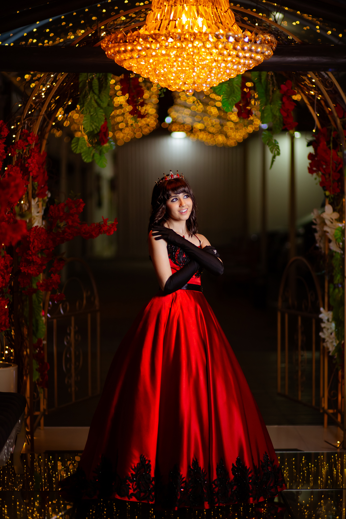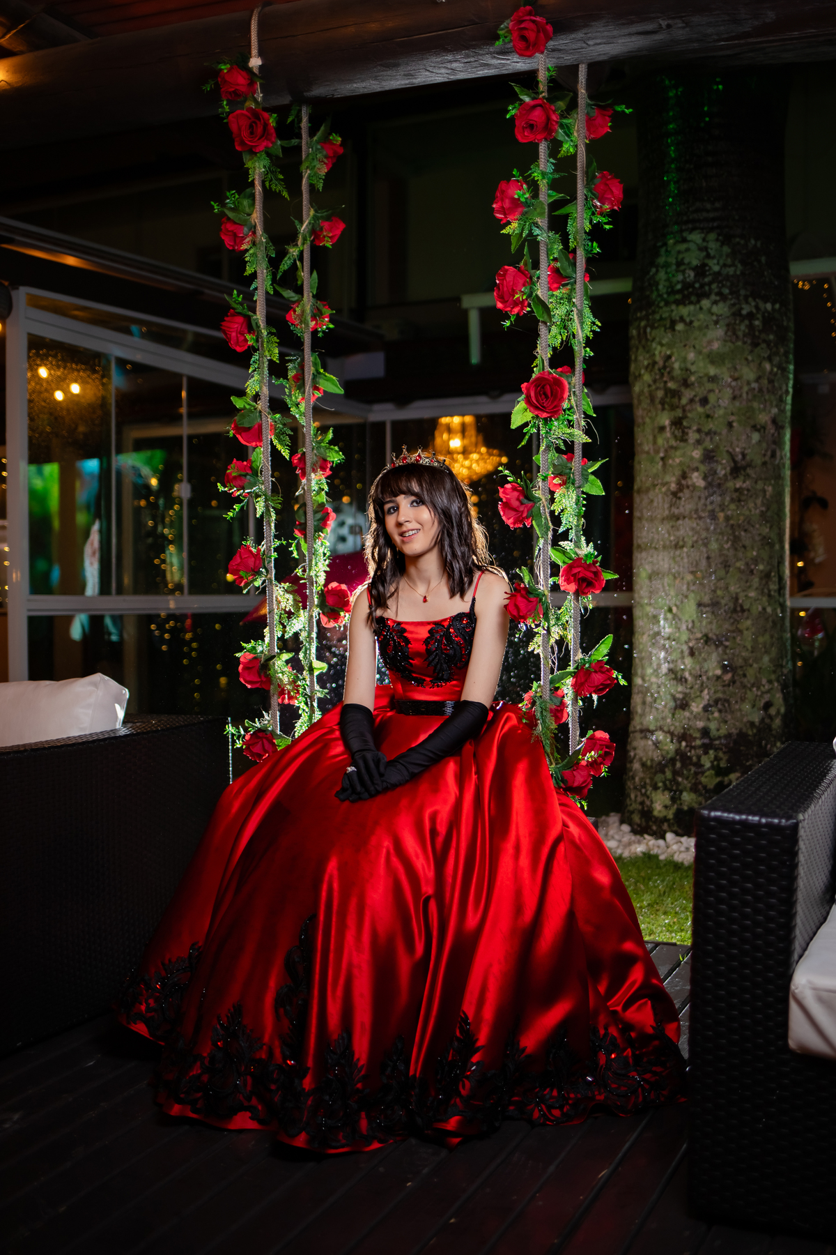 Ela chegou deslumbrante, com um vestido vermelho de princesa e um sorriso que iluminava todo o salão. A decoração estava impecável, cada detalhe pensado com carinho, e o ambiente exalava elegância e alegria.
