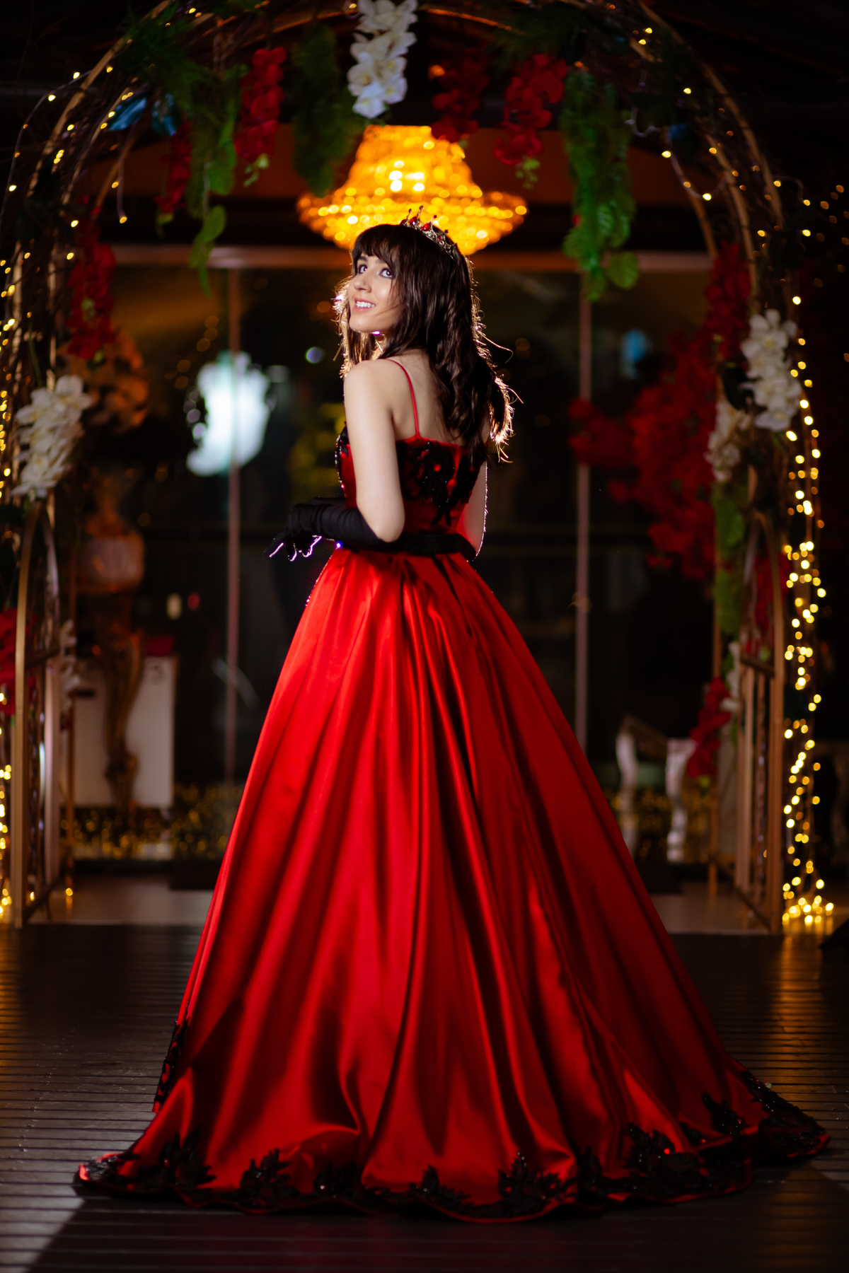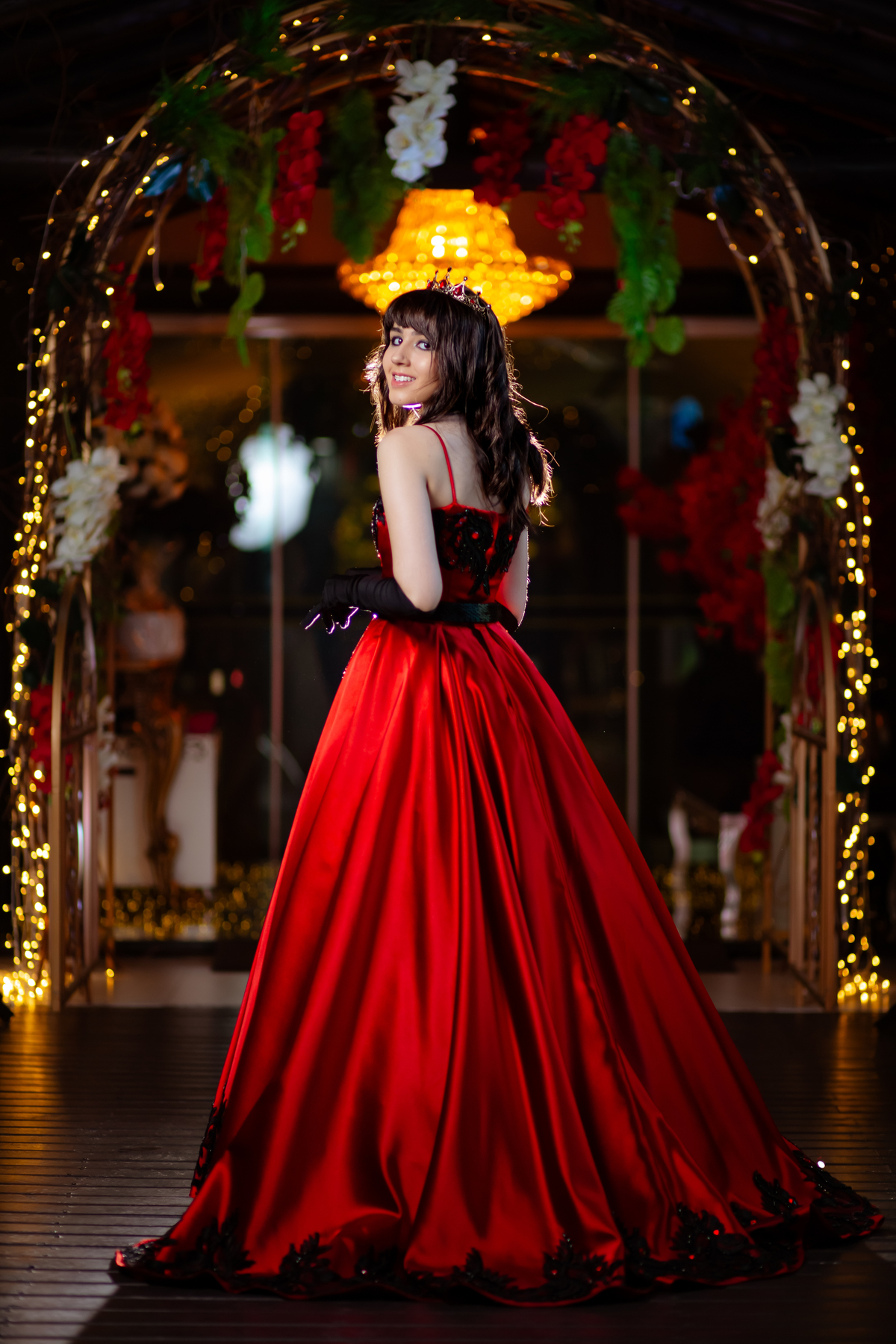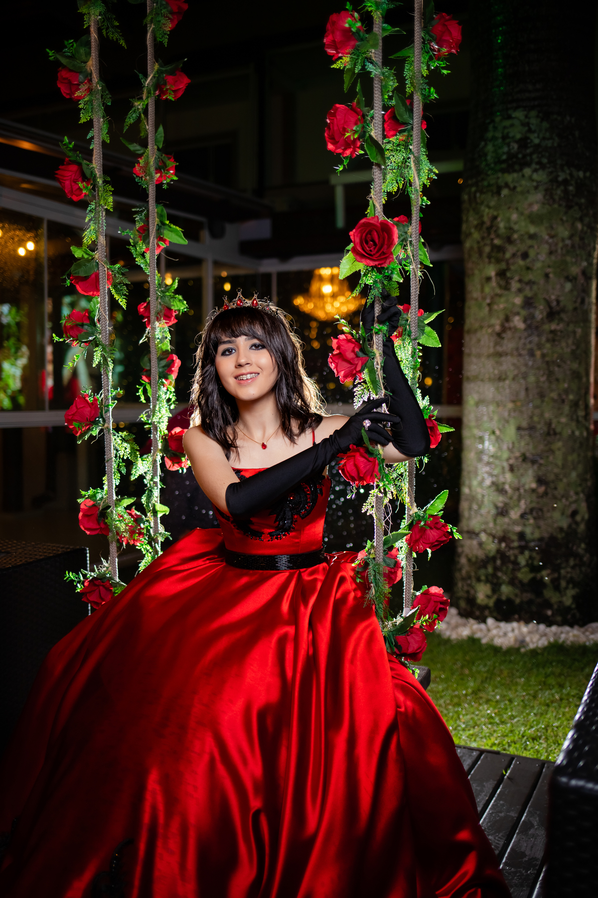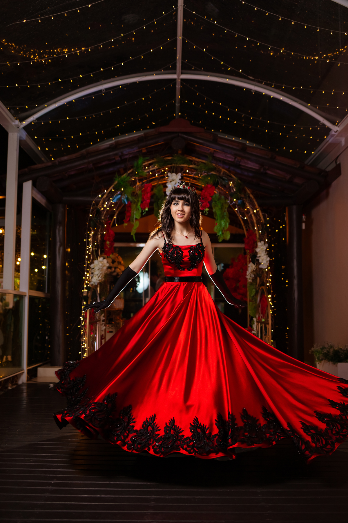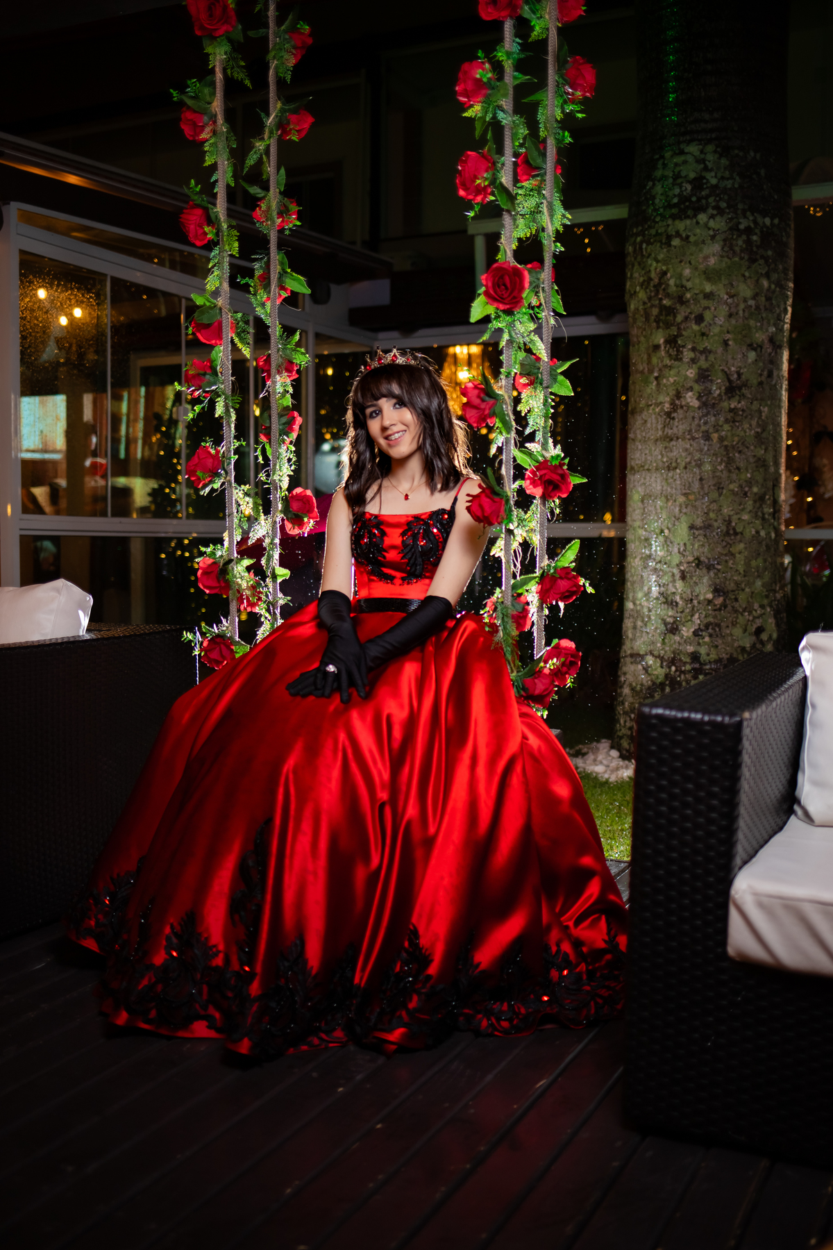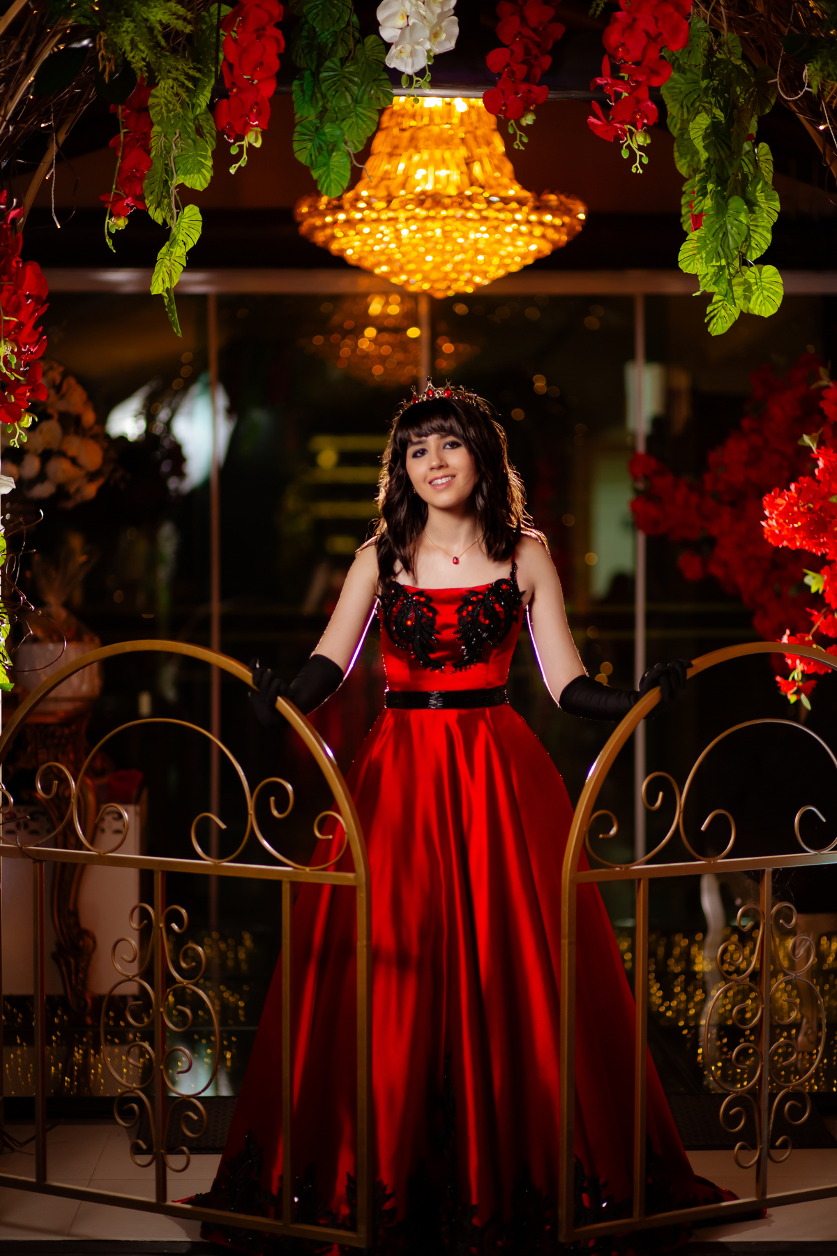 Ela chegou deslumbrante, com um vestido vermelho de princesa e um sorriso que iluminava todo o salão. A decoração estava impecável, cada detalhe pensado com carinho, e o ambiente exalava elegância e alegria.