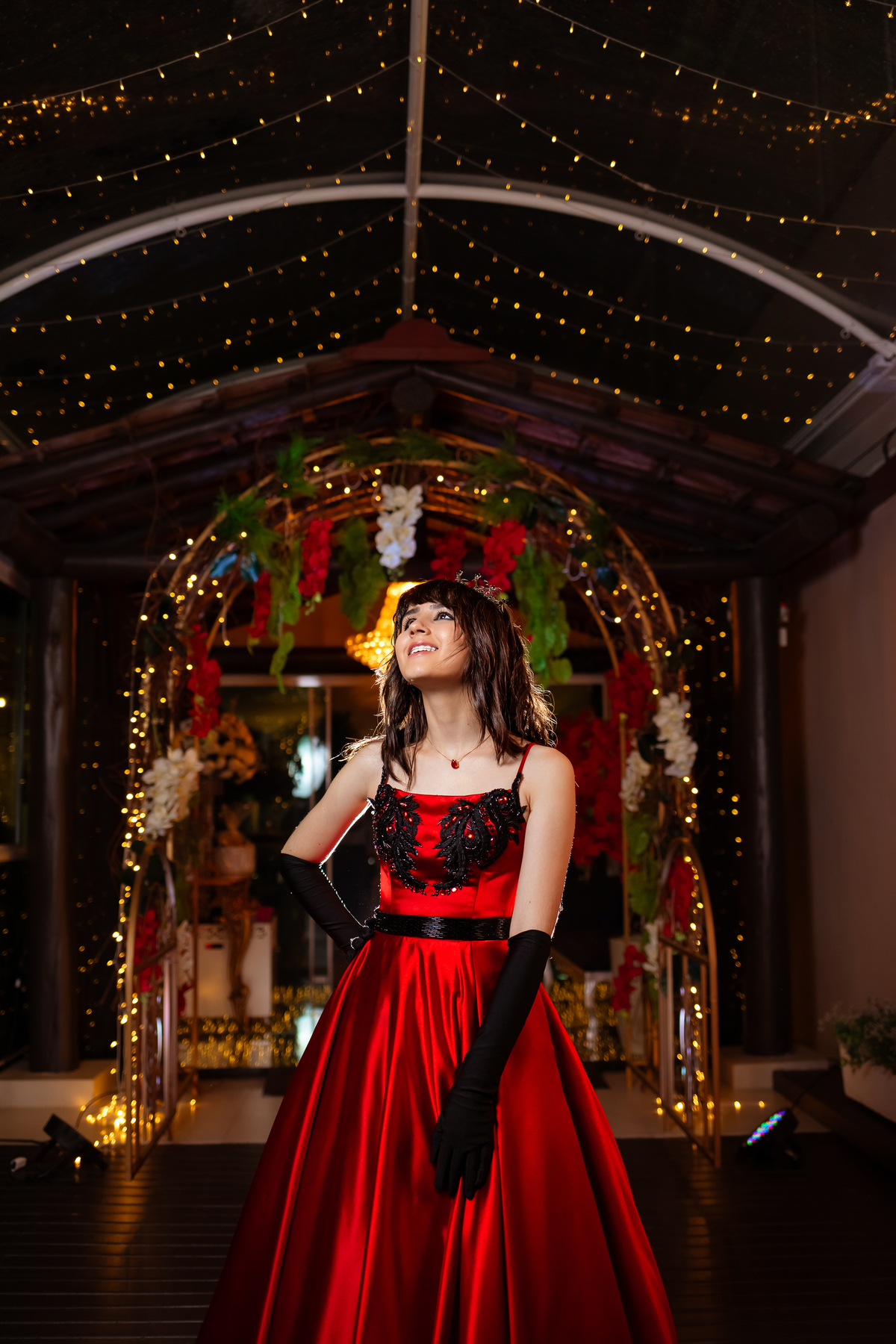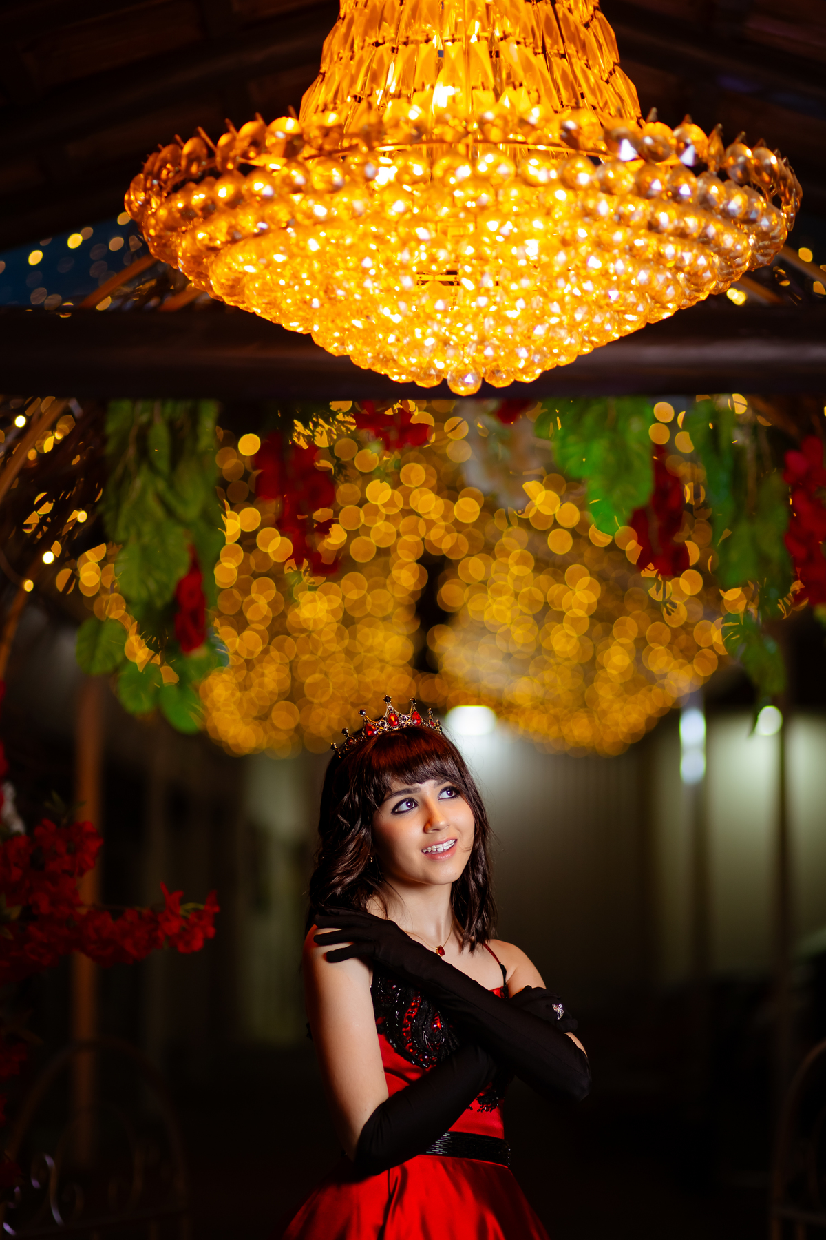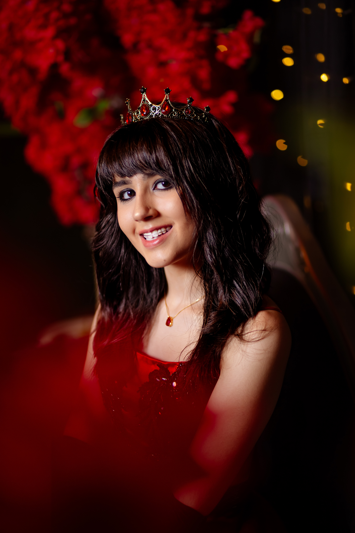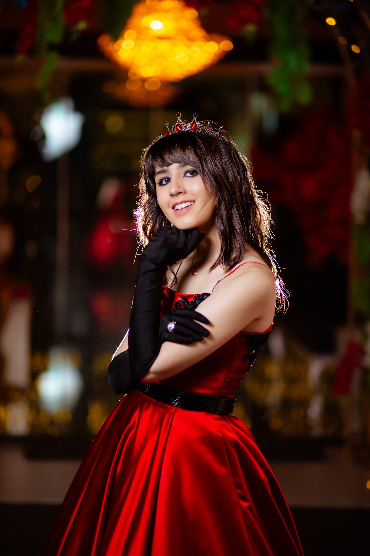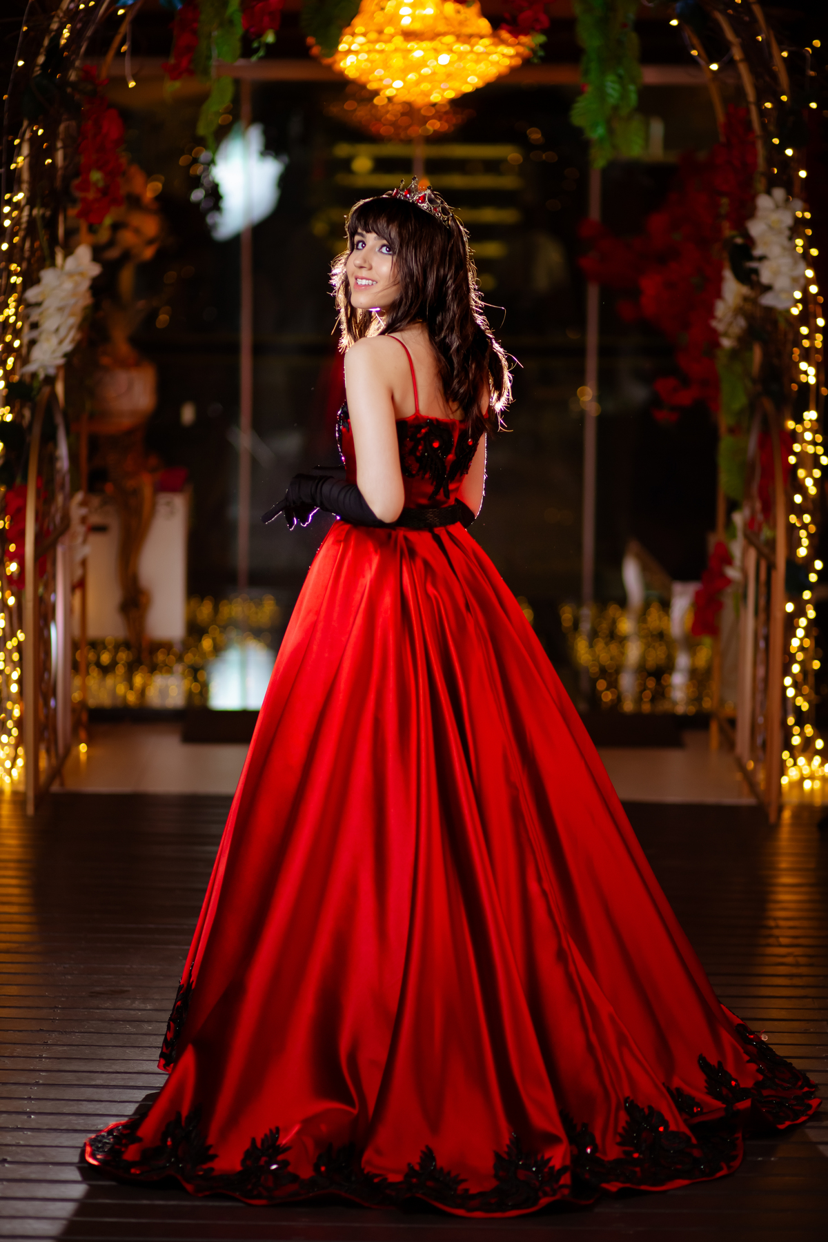 Ela chegou deslumbrante, com um vestido vermelho de princesa e um sorriso que iluminava todo o salão. A decoração estava impecável, cada detalhe pensado com carinho, e o ambiente exalava elegância e alegria.
