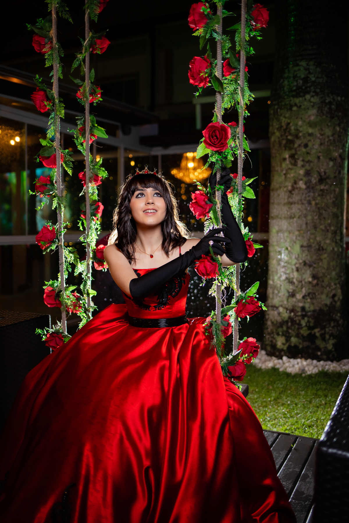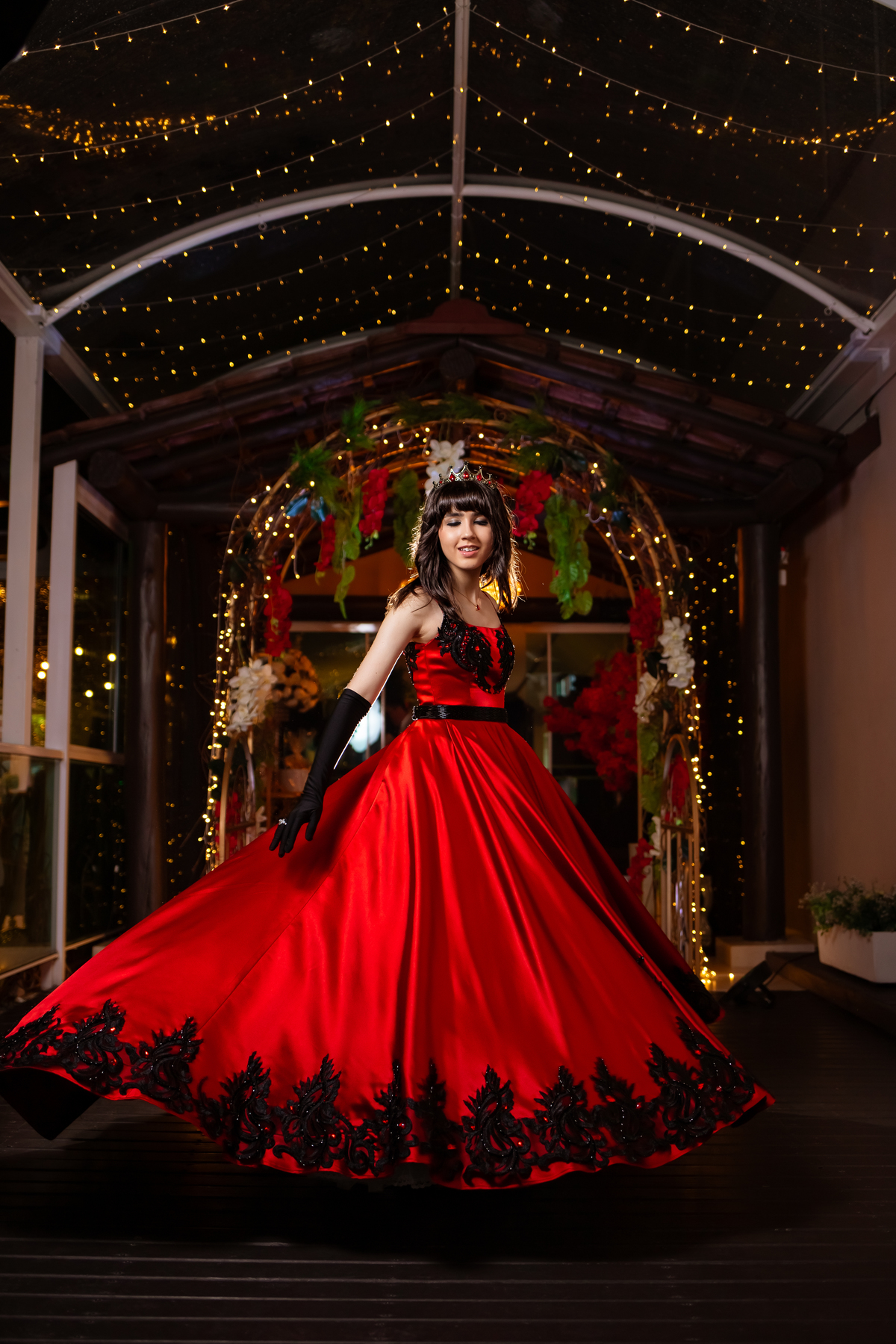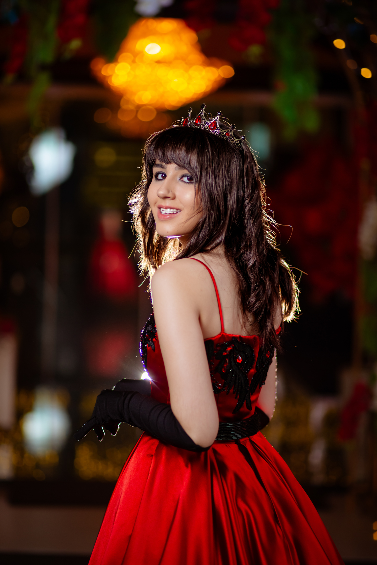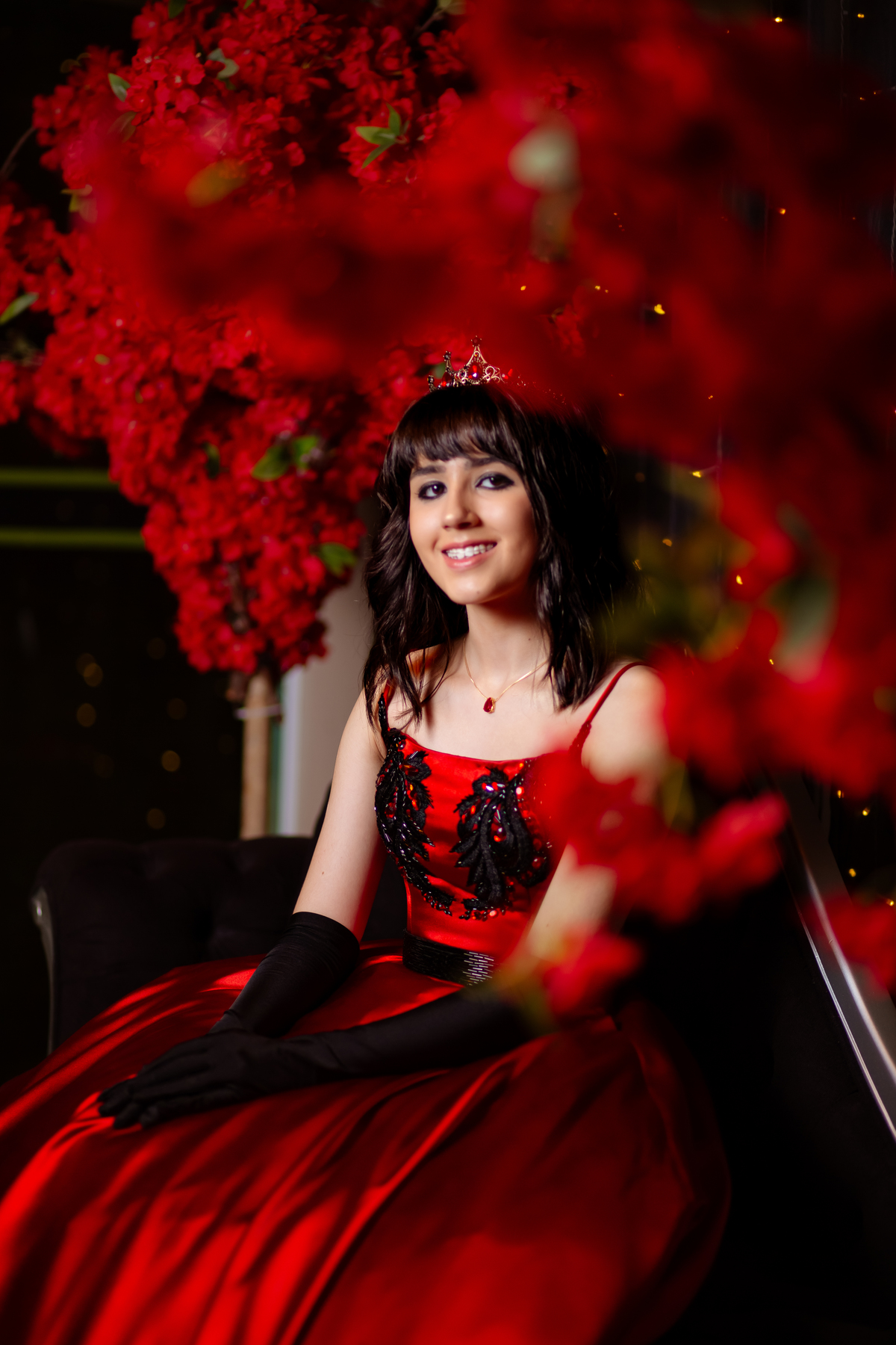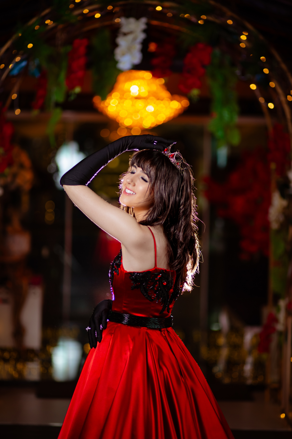 Ela chegou deslumbrante, com um vestido vermelho de princesa e um sorriso que iluminava todo o salão. A decoração estava impecável, cada detalhe pensado com carinho, e o ambiente exalava elegância e alegria.